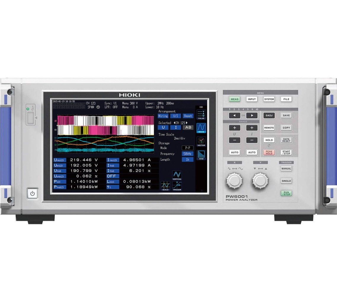 Hioki PW6001 stalinis galios matuoklis ir analizatorius, kuris dėka optiškai izoliuotų įėjimų gali atlikti tikslią ir išsamią visų grandinės komponentų galios analizę. Naudojamas R&D ir universitetų laboratorijose ar saulės ir vėjo jėgainėse.